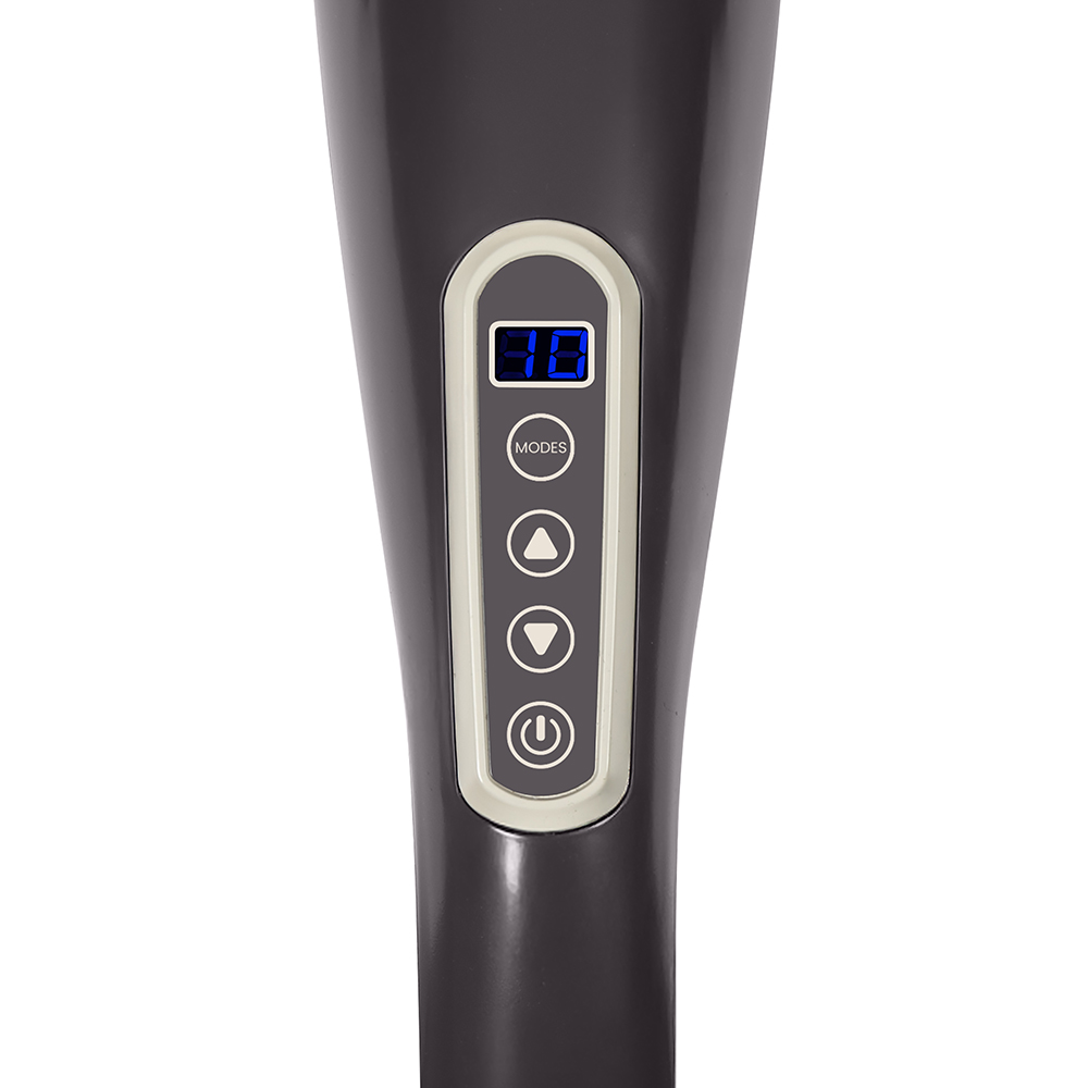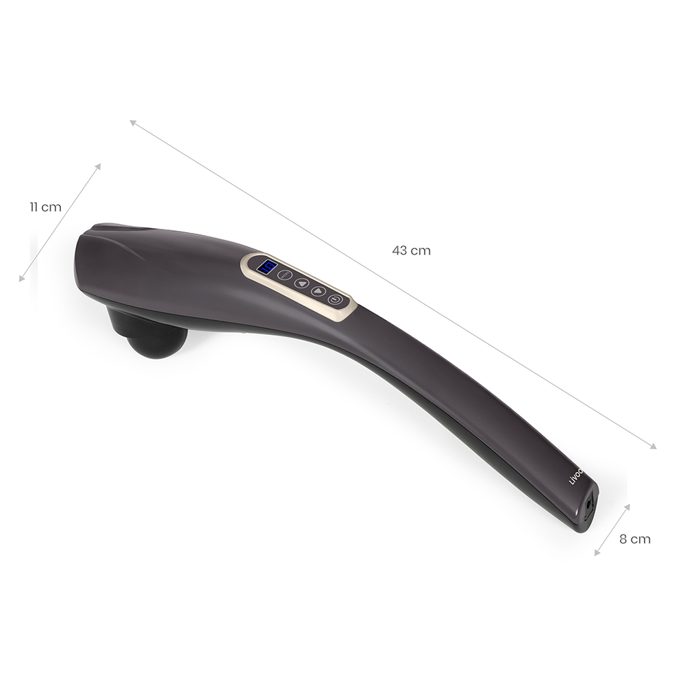 6 têtes de massage interchangeables pour les différentes parties du corps (cervicales, dos, hanches, cuisses, mollets). 10 vitesses. 12 modes de massage. Manche XXL. Batterie rechargeable 1200 mAh, autonomie 2 h. Arrêt automatique après 15 minutes. Puissance 24 W. Câble de charge inclus.