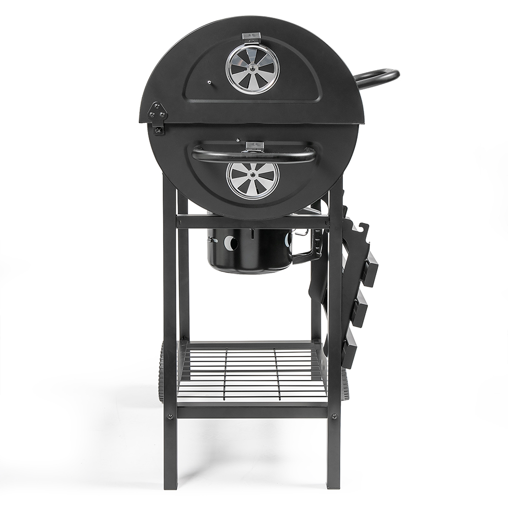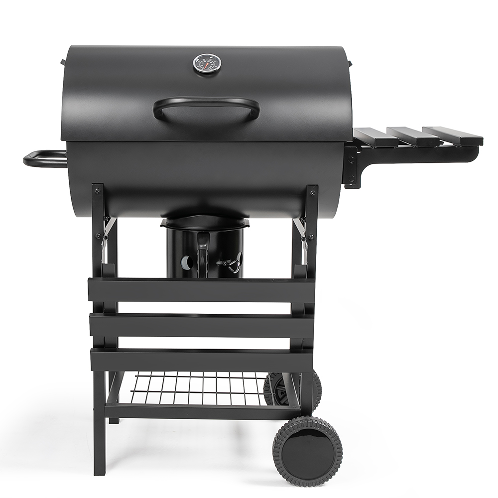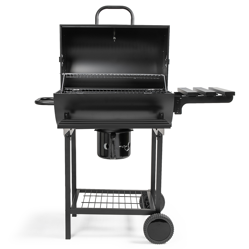 Surface de cuisson de 56 x 35,5 cm. Grille en acier chromé. Structure en acier traité époxy avec 2 valves d’aération. Hauteur de cuisson 74 cm. Couvercle avec thermomètre, poignée et 2 valves d’aération. Grille de maintien au chaud 53,5 x 18 cm. Tablettes repliables de 25 x 36 cm et 48 x 25 cm. Récupérateur de cendres amovible. Poignée de transport. Piètement avec zone de rangement de 33,5 x 43 cm et 2 roues crantées.