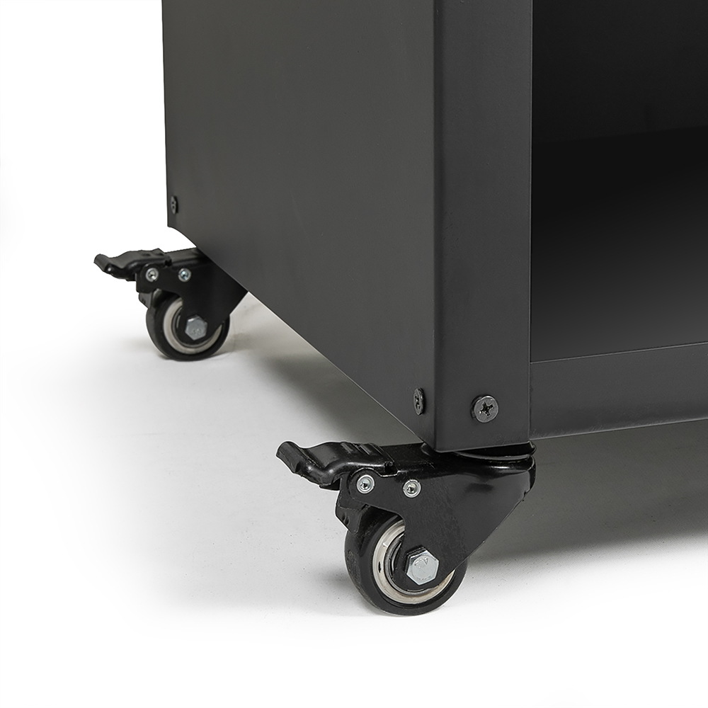 3 en 1 : brasero, barbecue et desserte. Grille en fer chromé. Structure en fer avec revêtement poudré et en MGO (fibre d’argile de magnésium). Hauteur de cuisson 82,5 cm. Hauteur de la desserte 64,5 cm. Plateau supérieur de 90 x 44,5 cm. 2 zones de rangement. Tisonnier inclus. 4 roues avec freins. Compatible bois et charbon. Brasero de 44,5 cm. Surface de cuisson : 41 cm de diamètre.