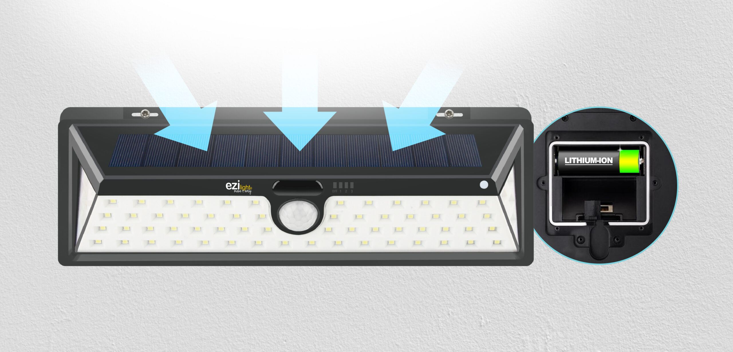 Équipée de batterie Lithium-Ion et d’un panneau solaire à haut rendement, votre applique solaire se recharge pendant la journée pour éclairer dès la nuit tombée. Types de modes: Continu, Détection de mouvements, Veille. Détecteur de mouvements: Jusqu’à 7 m. 54 Leds. Puissance: 60W – 500 Lumens. Plus de 50 000 h de lumière. Grand angle. Waterproof: IP44. Dimensions : ?15 x 10,5 x 5 cm.