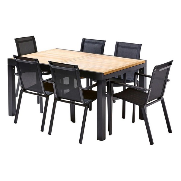 Ensemble 6 places comprenant 1 table en aluminium noire et plateau en Teck, 6 fauteuils en aluminium et assise noire en Textilène à séchage très rapide. Vous aurez à votre disposition un ensemble pouvant accueillir jusqu’à huit convives dans un confort remarquable. Dim. de la table fermée: H76 x P100 x L 150 cm. Dim. de la table ouverte: H76 x P100 x L 240 cm.