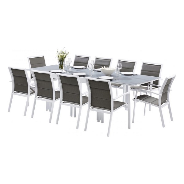 Ensemble comprenant 1 table en aluminium et verre trempé et 10 fauteuils en aluminium et assise textilène 100% Polyester tressé. Une simple manipulation permet en effet de sortir sans effort les rallonges et de les remettre en place grâce à des guidages très précis. Vous aurez à votre disposition un ensemble pouvant accueillir dix convives dans un confort remarquable. Dim. de la table: H75 x P105 x L 135/270 cm. Dim. du fauteuil : H87 x P61 x l57 cm.