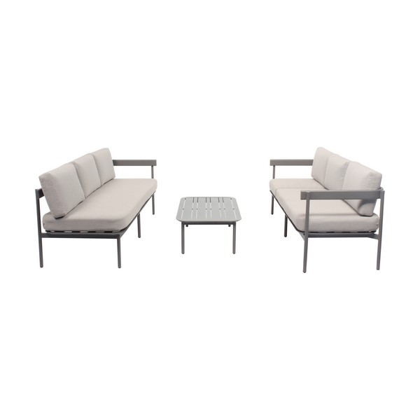 Salon de jardin: une table et 2 fauteuils 3 places. Design : Aluminium taupe et tissus beige/gris mélangé. Confort : Fauteuil avec accoudoirs et dossier ajustable en 4 positions, convertible en transat. Praticité : Sièges modulables, coussins déhoussables et attachables. Utilisation : Salon en L ou face à face, idéal pour une oasis de détente. Finition : Courbes douces et finitions impeccables. Dimensions : Fauteuils avec accoudoir: 207 x 73 x 68 cm et 204 x 73 x 68 cm. Table basse : 110 x 59,5 x 32 cm. LDF: 45