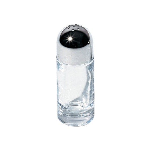 Salière en acier brillant et cristal. Capacité: 3.5 cl. Diamètre: 3.5 cm.