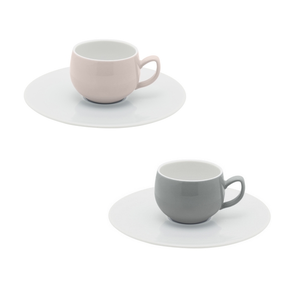 Coffret comprenant : – 1 Tasse rose. – 1 Tasse grise. – 2 Soucoupes 16 cm blanches. Matière : Porcelaine. Adaptée au lave vaisselle et micro-ondes.