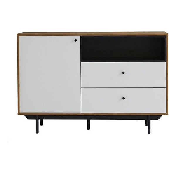 Moderne et pratique, ce joli buffet est composé de nombreux rangements : 2 tiroirs, un placard et Matières : MDF (panneau de fibres de bois) et pieds en métal peint dimensions: 117.4 x 39.6 x 78.2 cm. Poids maxi supporté : 80 kg.