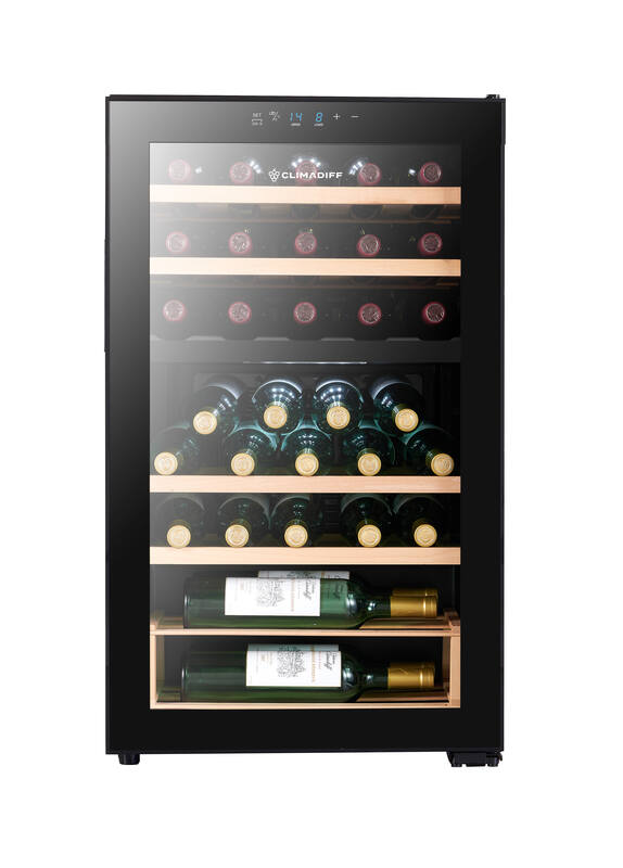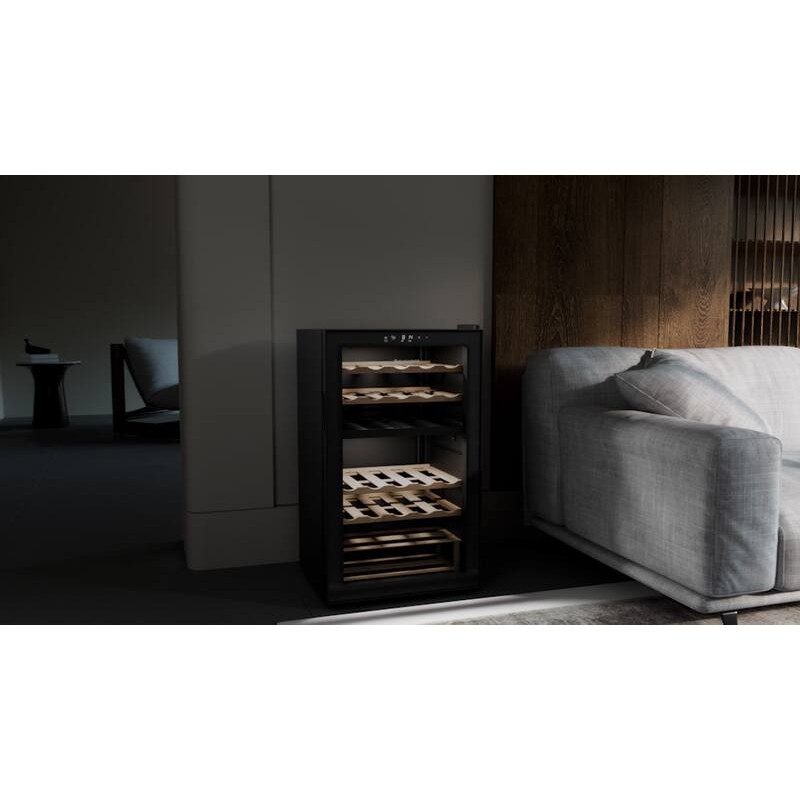 Cave à vin de service double zone 33 bouteilles. 2 zones (Zone sup : 5-20degré(s)C/15btles + Zone inf: 5-20degré(s)C/18btles). Contrôle électronique. 4 clayettes bois de hêtre, porte vitrée, pieds ajustables, éclairage intérieur LED, 36dB. Classe énergie G. Dimensions : 49,5 x 43 x 84,8 cm. Cave livrée sans bouteilles. L’abus d’alcool est dangereux pour la santé, à consommer avec modération. Livraison RDC / Pas de porte.