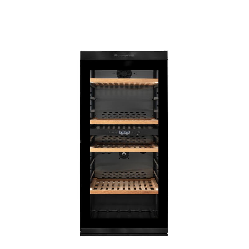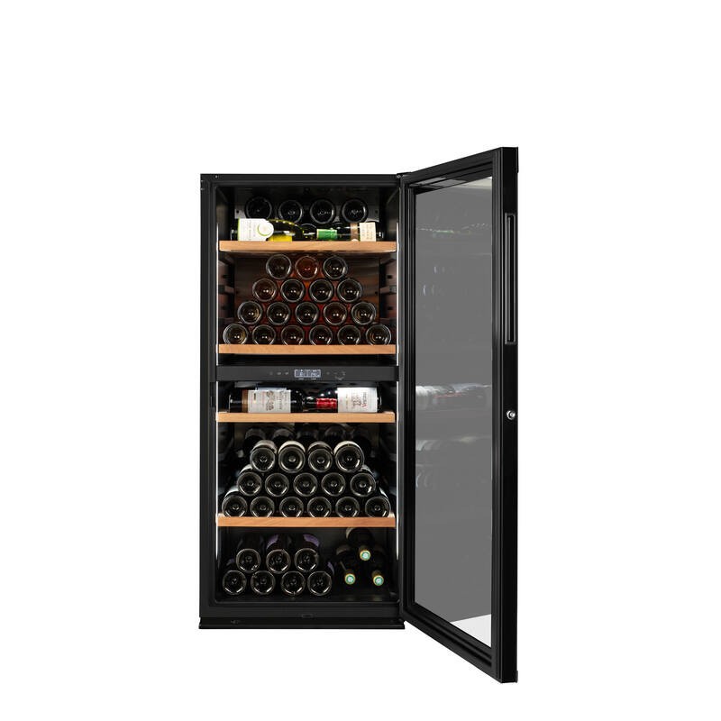 Cave à vin de vieillissement connectée (wifi) avec contrôle à distance double zone 138 bouteilles. 2 clayette sapelli tête bêche + 2 clayettes sapelli horizontale. Régulation électronique, écran LCD avec gestion de la cave sur le panneau de contrôle et via une application. Fonction hiver, système anti vibration, filtre à charbon Porte vitrée et éclairage LED latéral, 37 dB, classe F. Dimensions : 59.5 x 125 x 69.6 cm. Cave livrée sans bouteilles. L’abus d’alcool est dangereux pour la santé, à consommer avec modération. Livraison RDC / Pas de porte.