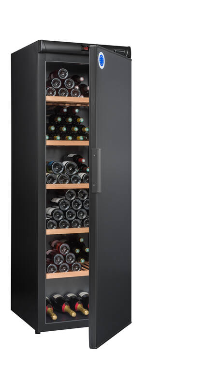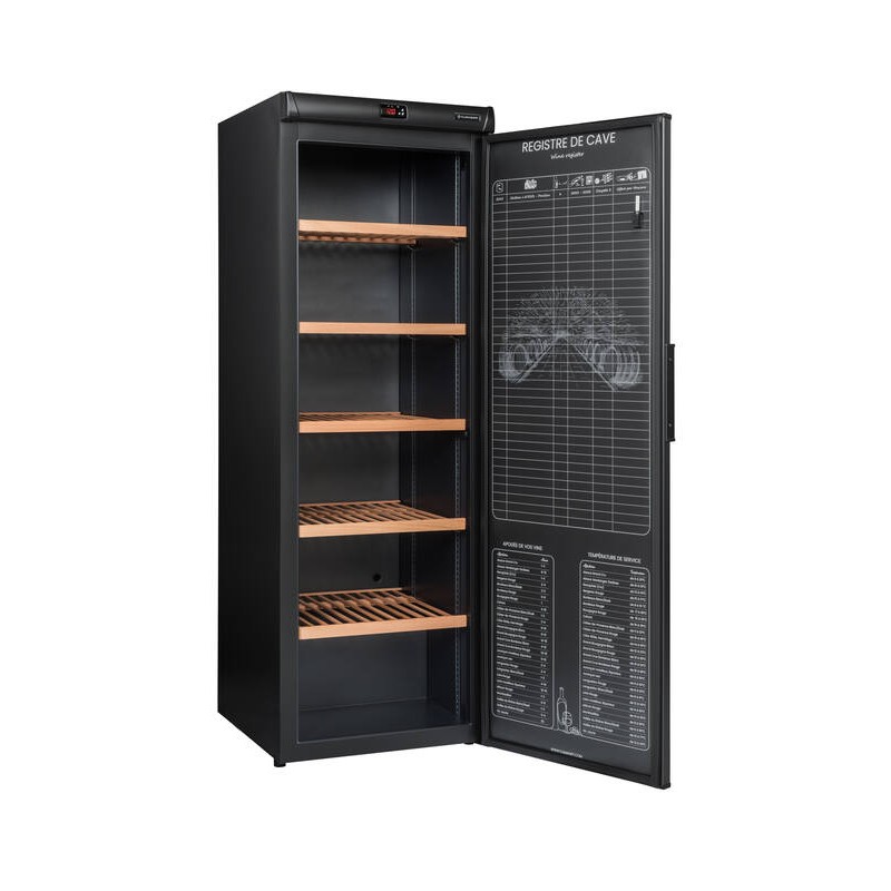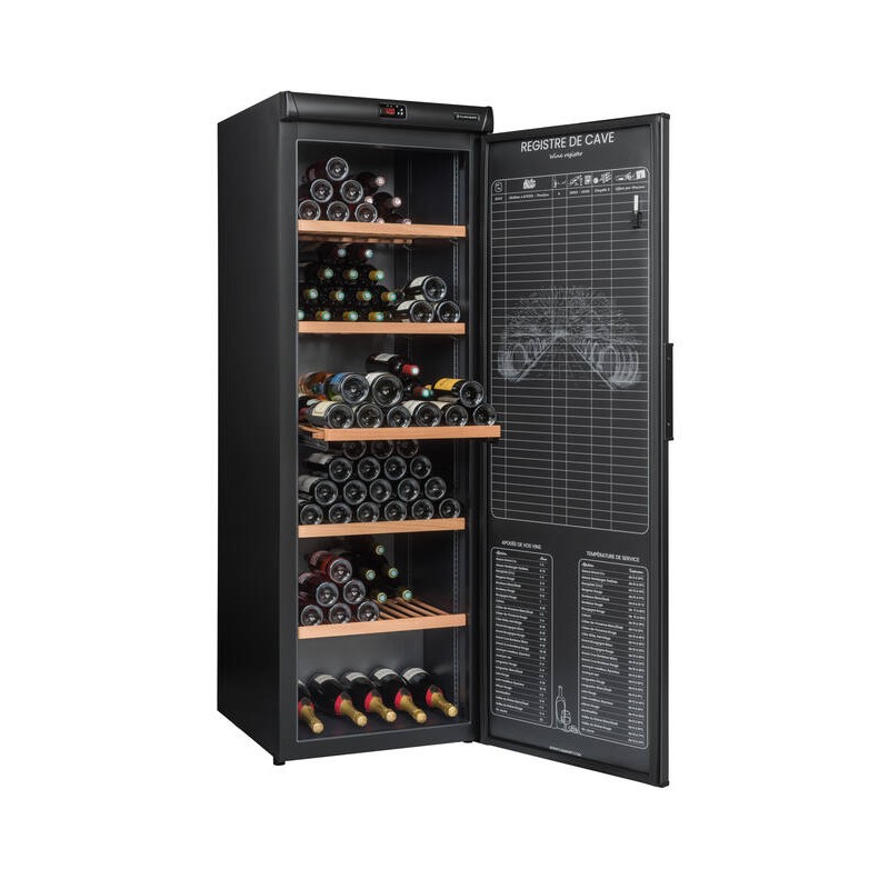 Cave à vin de vieillissement 264 bouteilles 5 clayettes bois. (dont 1 coulissante), compresseur (froid statique), Température réglable 5-18degré(s)C, régulation électronique, thermomètre à affichage électronique rouge,. Fonction hiver, système anti-vibration, filtre à charbon. Porte pleine avec contre porte registre de cave. Dimensions : 62 x 186 x 71 cm. Cave livrée sans bouteilles. L’abus d’alcool est dangereux pour la santé, à consommer avec modération. Livraison RDC / Pas de porte.