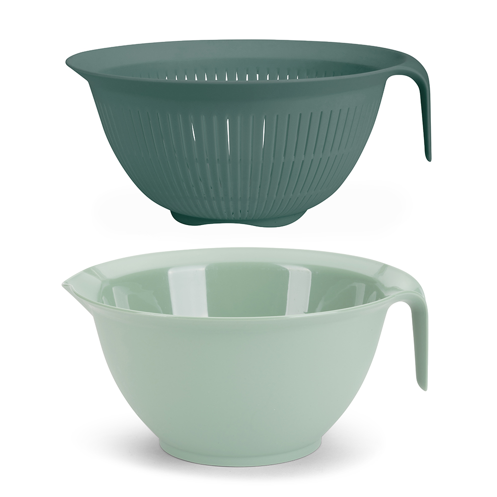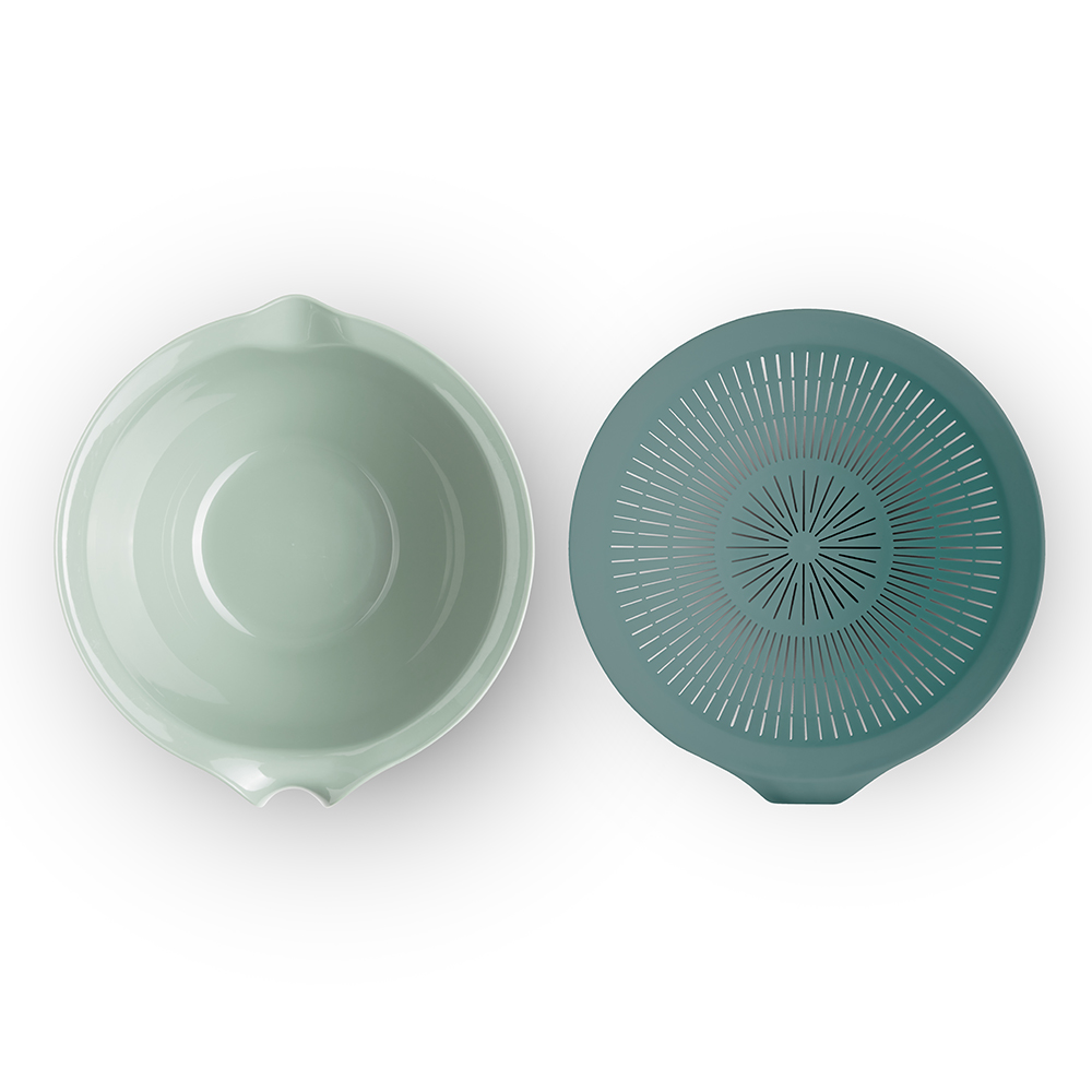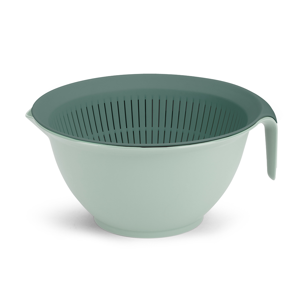 2 en 1 : bol mélangeur et passoire emboitables. Capacité individuelle du bol et de la passoire : 3 L. Poignées ergonomiques. Panier à égoutter en maille fine. Bol avec bec verseur et base antidérapante. Compatible lave-vaisselle.