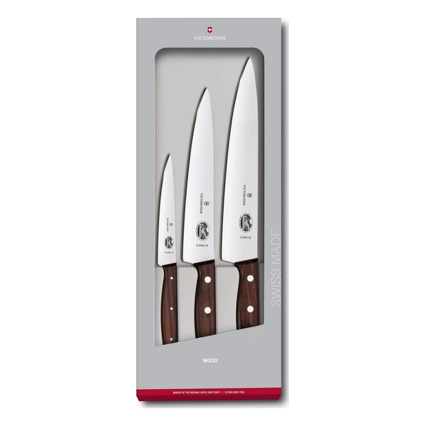 Coffret à découper, 3 couteaux, manche érable modifié, comprenant : 1 couteau éminceur/cuisine 12 cm. 1 couteau à découper 19 cm. 1 couteau à découper 22 cm.