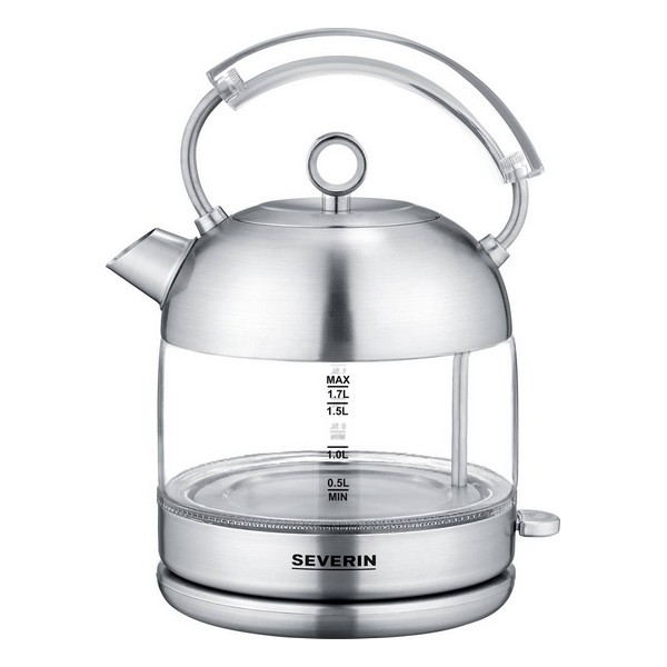 Bouilloire électrique en acier inoxydable et en verre de haute qualité. Grande capacité de 1,7 litres. Eclairage intérieur bleuté. Arrêt automatique dès l’ébullition Sécurité contre la surchauffe Bec verseur Puissance: 2400W.