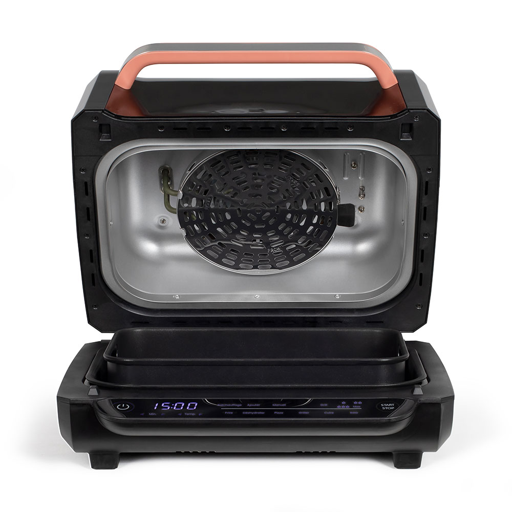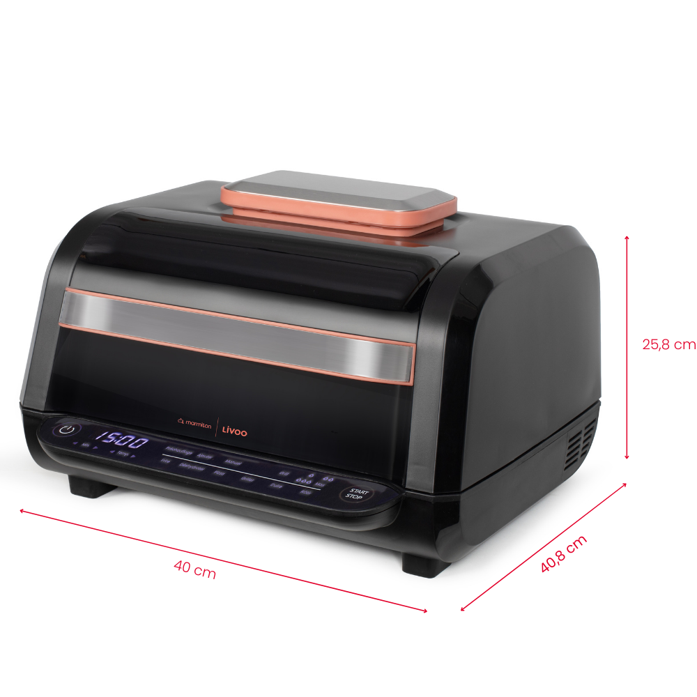 Capacité 6 L. Puissance 1500-1700 W. 2 en 1 : mode friteuse sans huile et mode grill l’intérieur. 8 programmes de cuisson : frire sans huile, rôtir, déshydrater, cuire, griller, Pizza, fonction Grill et fonction manuelle. 4 réglages de chauffe du grill : bas, moyen, haut, max. Température ajustable de 50degré(s)C à 230 degré(s)C par paliers de 5 degré(s)C. Minuterie jusqu’à 2 H. Panneau de commande LED tactile. Signal sonore de fin de cuisson, arrêt automatique. Poignée thermorésistante, revêtement antiadhésif, pieds antidérapants. Accessoires inclus : 1 plaque pour grill, 1 panier de cuisson, 1 cuve et une brosse de nettoyage. Marmiton.