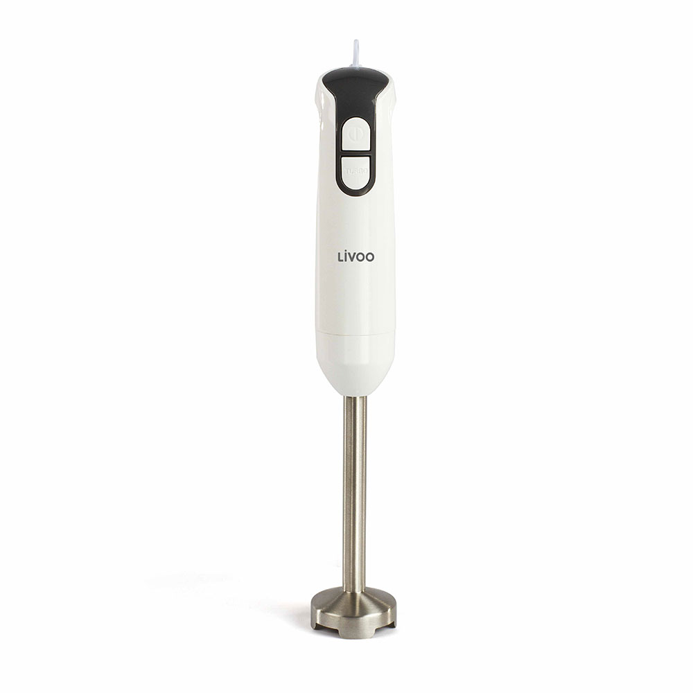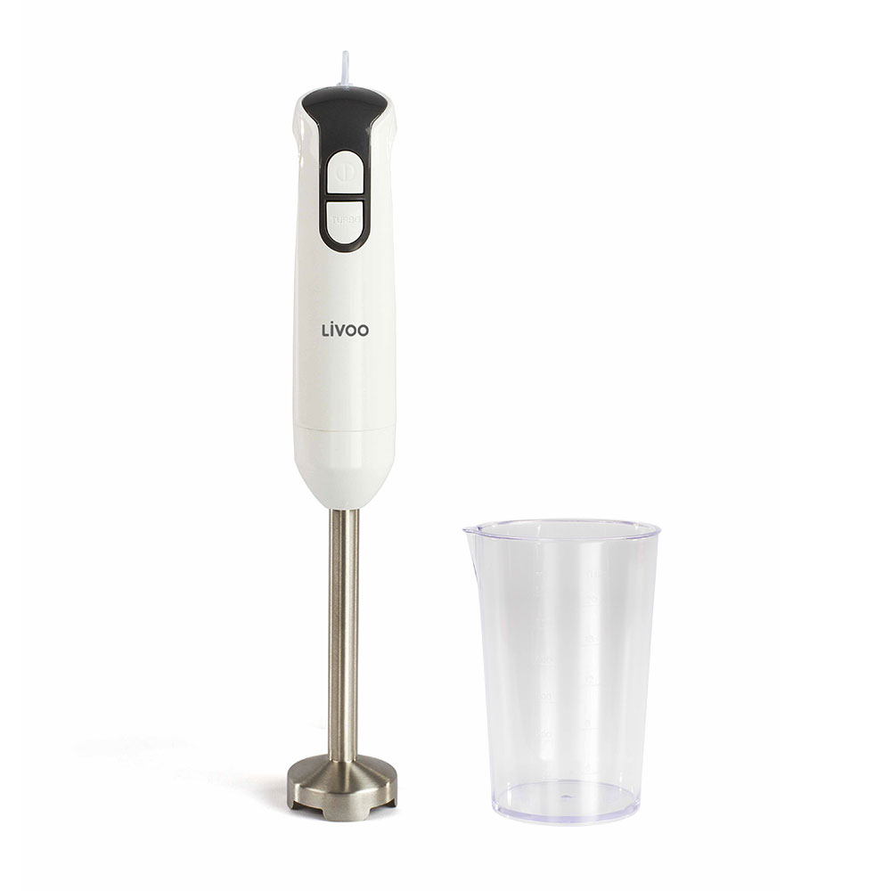 Puissance 400 W. 2 lames acier inoxydable. Base avec deux boutons : marche/arrêt et fonction turbo. Pied amovible. Bol gradué 600 ml inclus. Poignée ergonomique. Anneau de suspension pour un rangement facilité. Tours par minute : 12 000.
