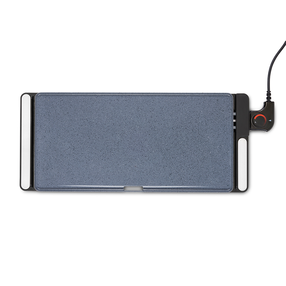 Surface de cuisson : 50 x 25 cm. Plaque en fonte d’aluminium avec revêtement céramique aspect pierre, sans PFOA ni PFOS. Puissance 2200 W. Thermostat ajustable et amovible. Habillage avec touches d’acier inoxydable. Bac récupérateur de graisse amovible.