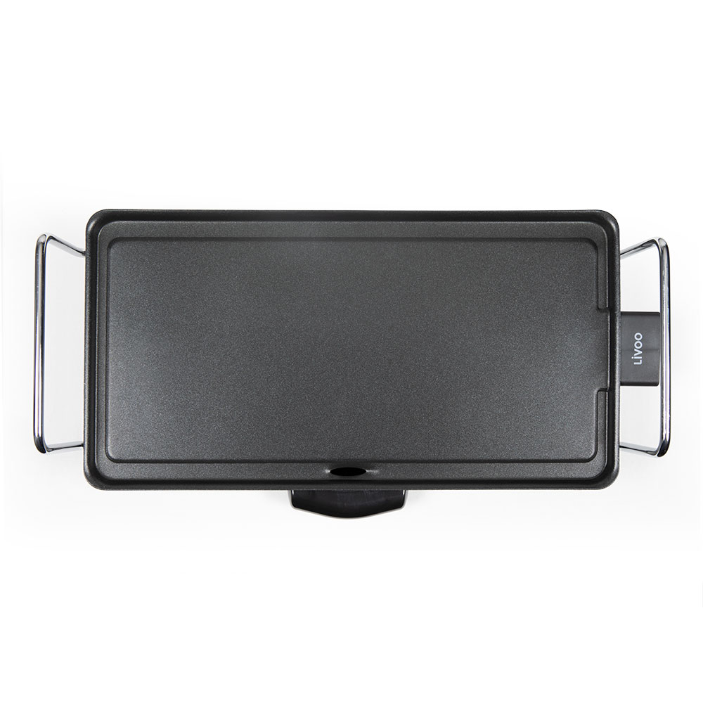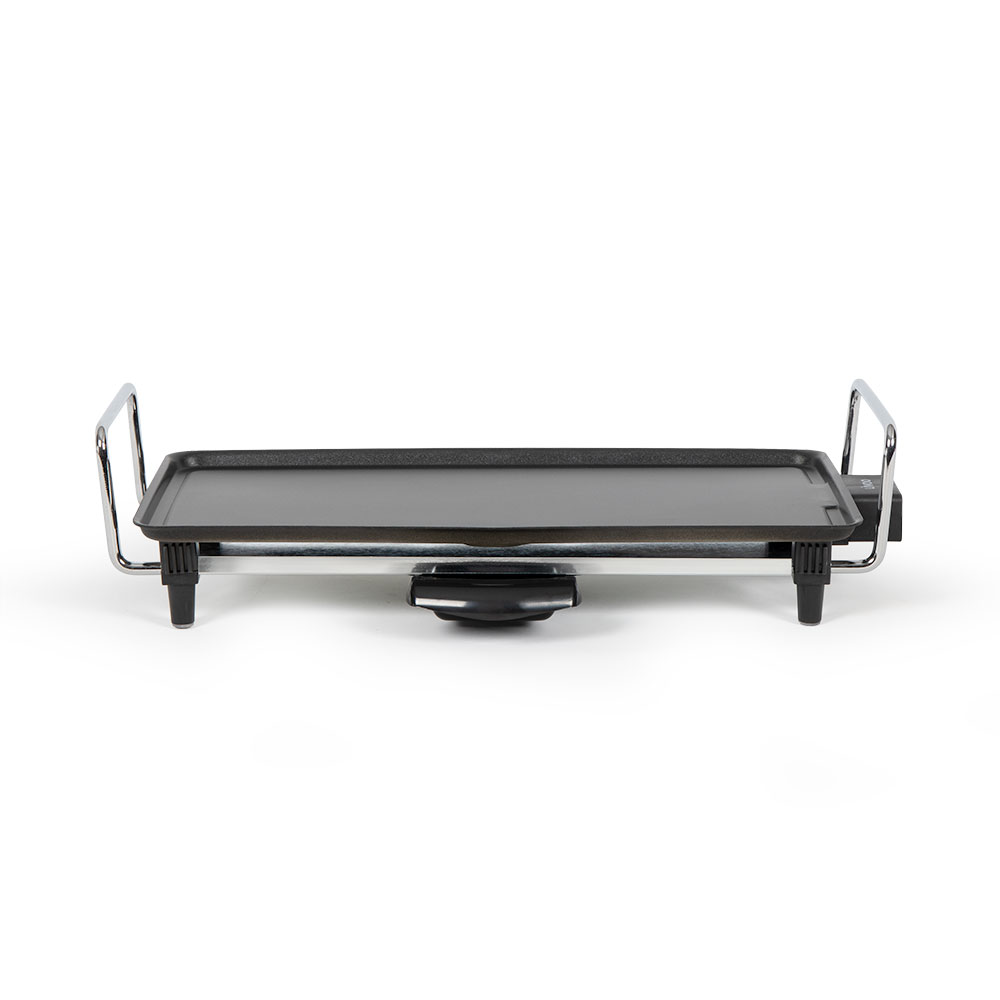 Surface de cuisson 43 x 22,5 cm. Revêtement antiadhésif. Puissance 2000 W. Thermostat réglable amovible avec témoin lumineux de chauffe. Epaisseur de plaque de 2,2 mm. Bac récupérateur de graisse amovible. 4 pieds antidérapants.