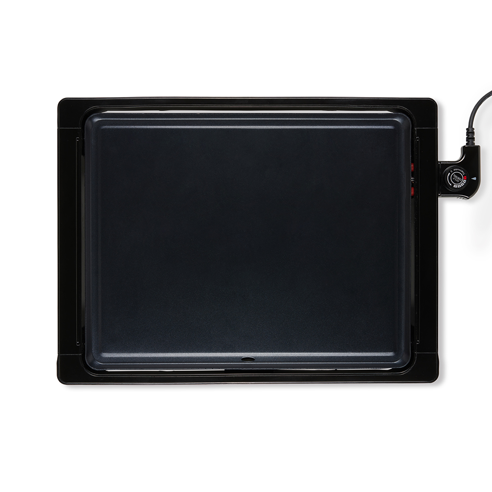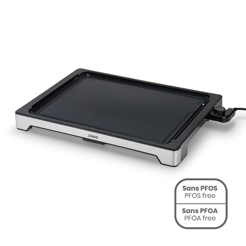 Plaque en fonte d’aluminium avec revêtement antiadhésif sans PFOA ni PFOS. Puissance 2000 W. Thermostat ajustable et amovible. Habillage avec touches d’acier inoxydable. Bac récupérateur de graisse amovible. Surface de cuisson : 47 x 37 cm.