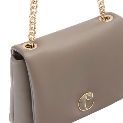 Type : Sac bandoulière ou d’épaule – grand format, spacieux. Matière principale : Polyuréthane (cuir végétal mat). Finition : Effet matelassé, toucher doux. Couleur : Taupe (désignée ici comme Medium Grey). Finitions dorées chaleureuses. Plaque logo “C” dorée avec finition ABS taupe. Bandoulière signature avec nœud décoratif et chaîne métal. Logo “Cacharel” discret embossé. Dimensions : 280 x 80 x 200 mm.