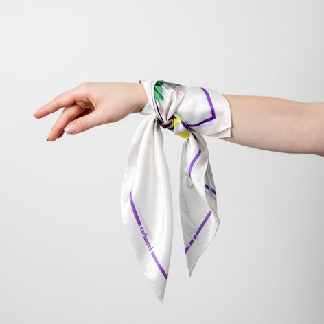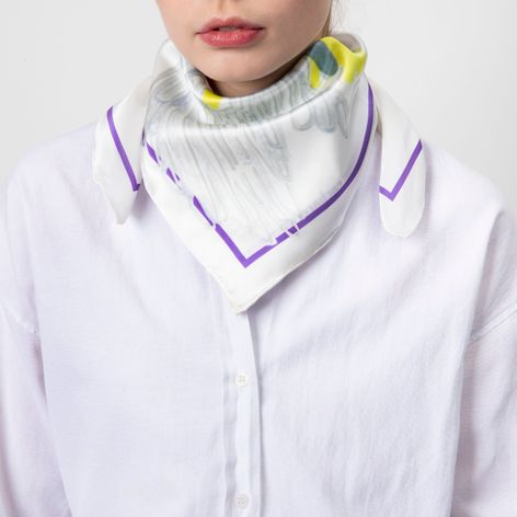 Vibrant imprimé floral sur fond blanc s’inspirant d’un jardin exotique. 100% soie. Dimension carrée: 65 x 65 cm.