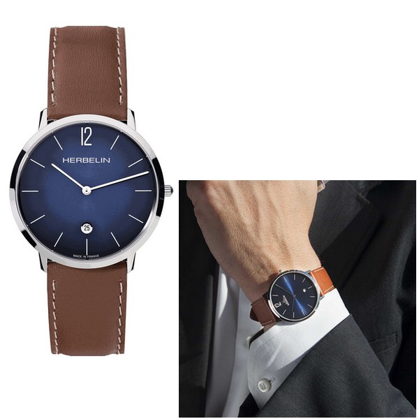 Herbelin, fleuron historique de l’horlogerie française depuis plus de 70 ans. Boîtier en acier. Bracelet cuir marron avec boucle ardillon. Cadran Bleu soleillé. Etanche: 3 ATM. Mouvement quartz Suisse. Fabriquée en France.
