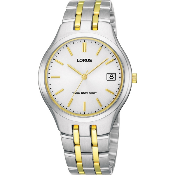 Mouvement quartz, 3 aiguilles. Fonction : date. Boitier et bracelet en acier inoxydable avec revêtement doré et palladium. Etanchéité : 5 bar. Diamètre : 35 mm.